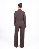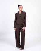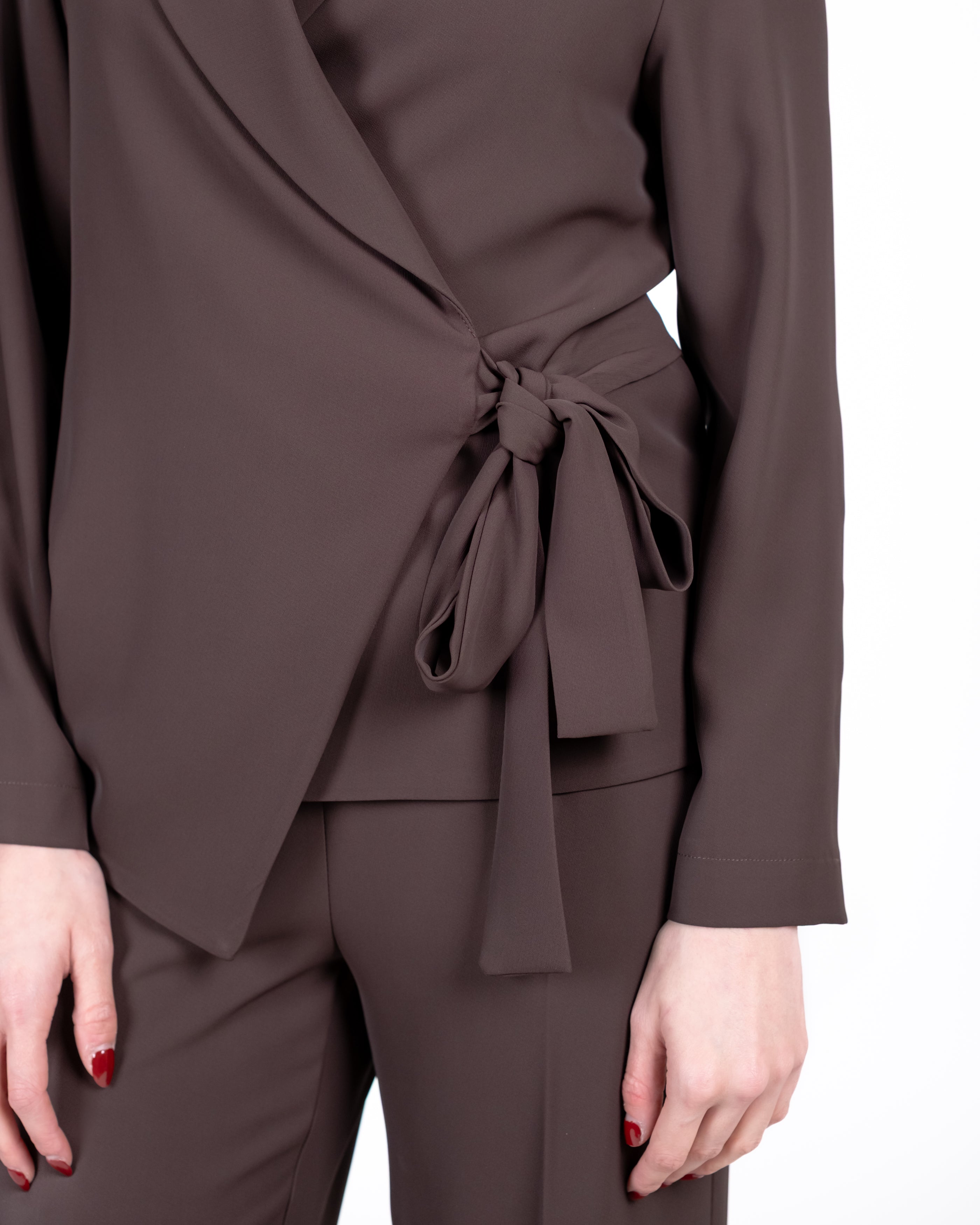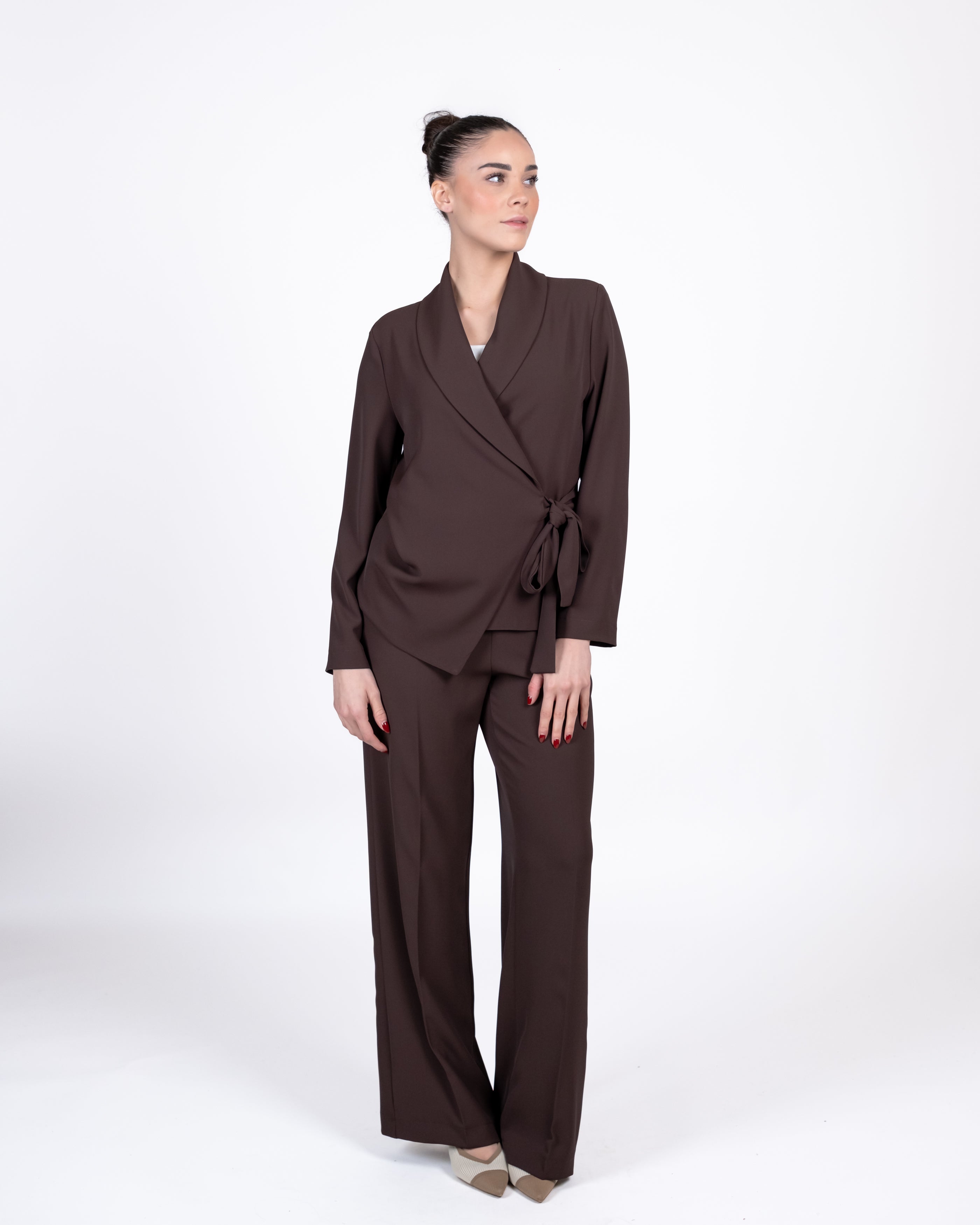 Completo tessuto fluido giacca con cinta a fiocco e pantalone palazzo con elastico dietro e tasche.