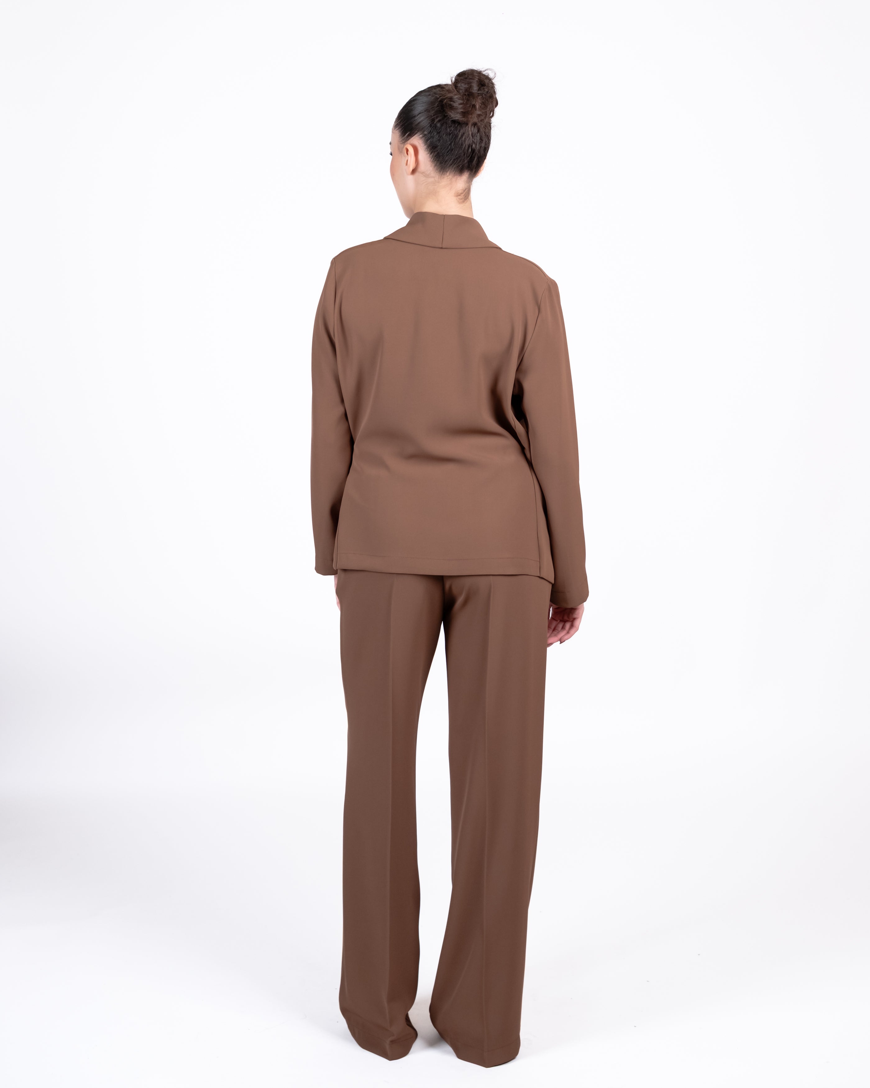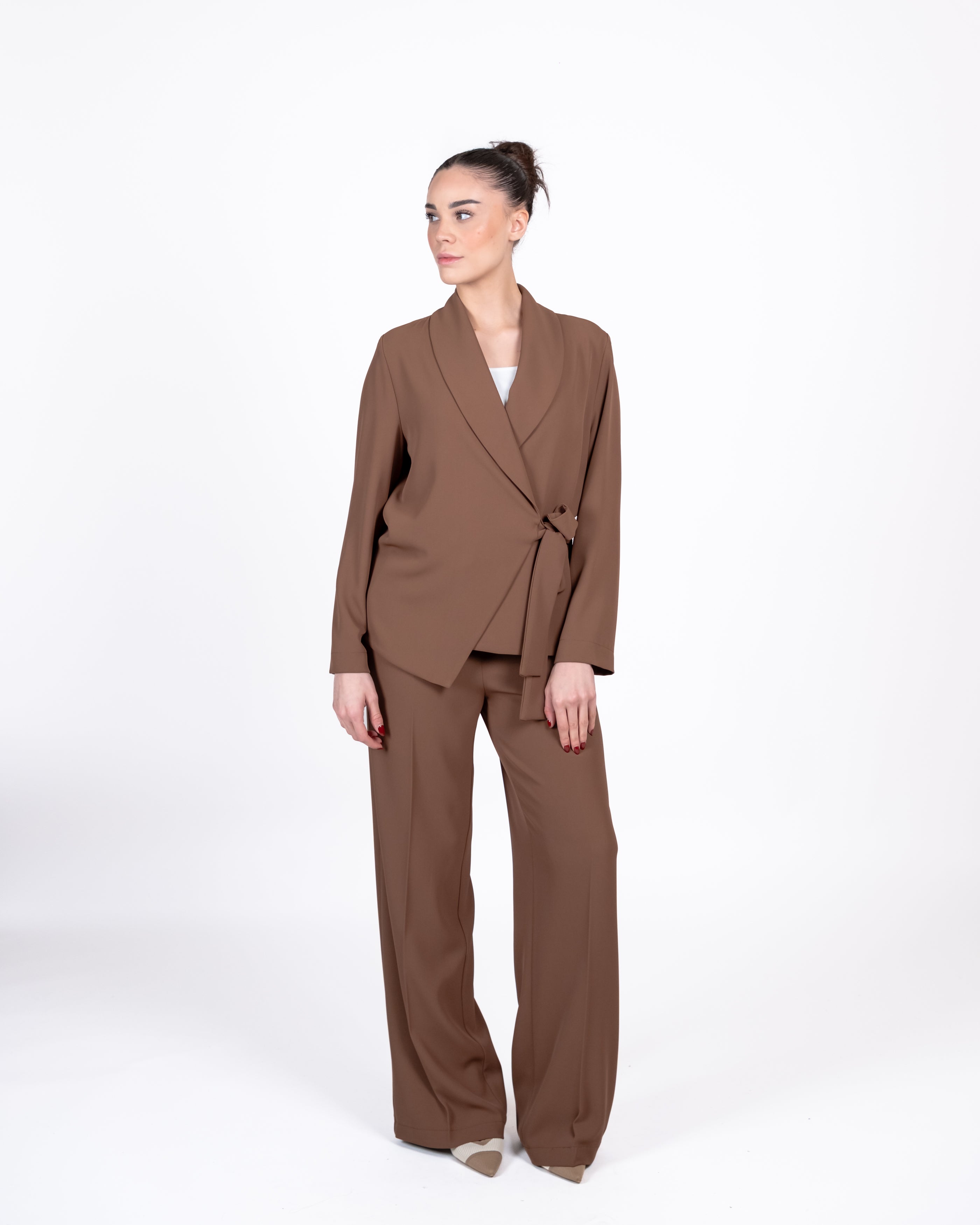 Completo tessuto fluido giacca con cinta a fiocco e pantalone palazzo con elastico dietro e tasche.