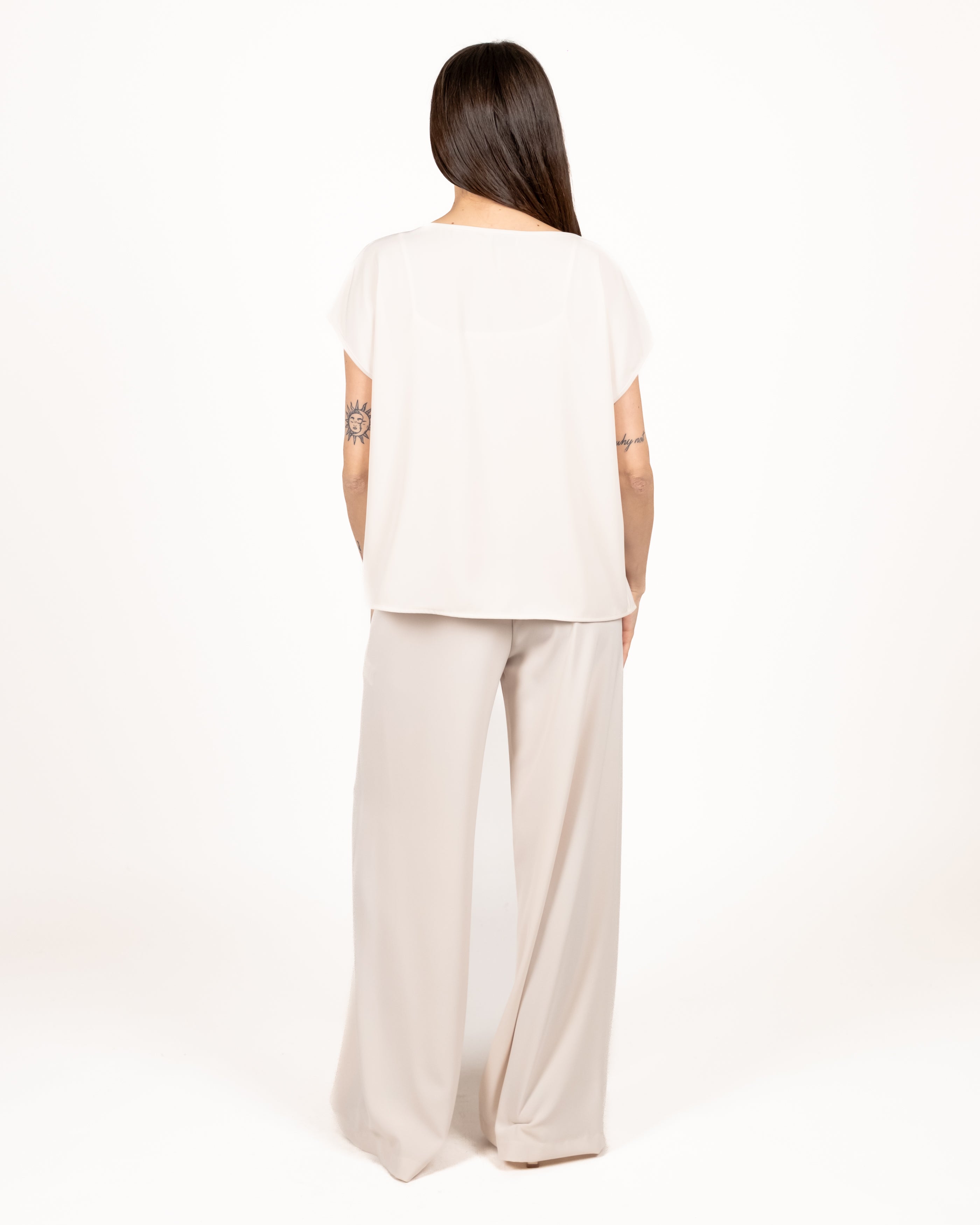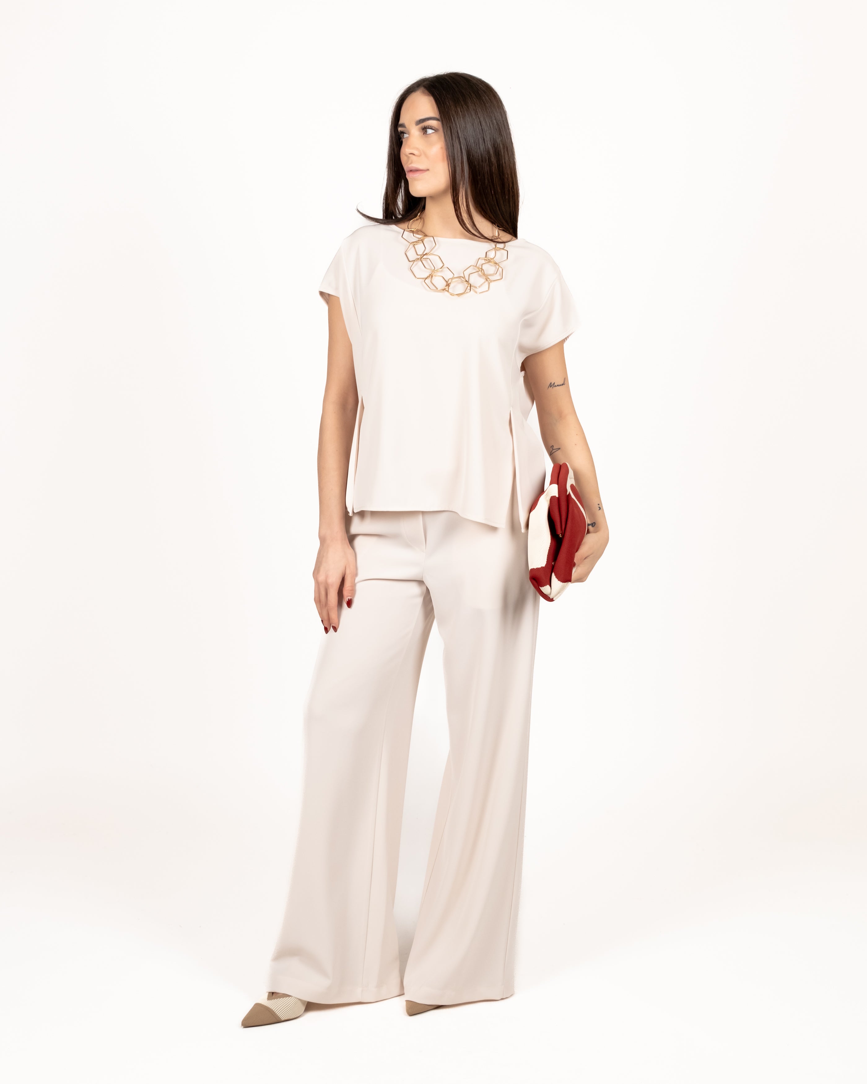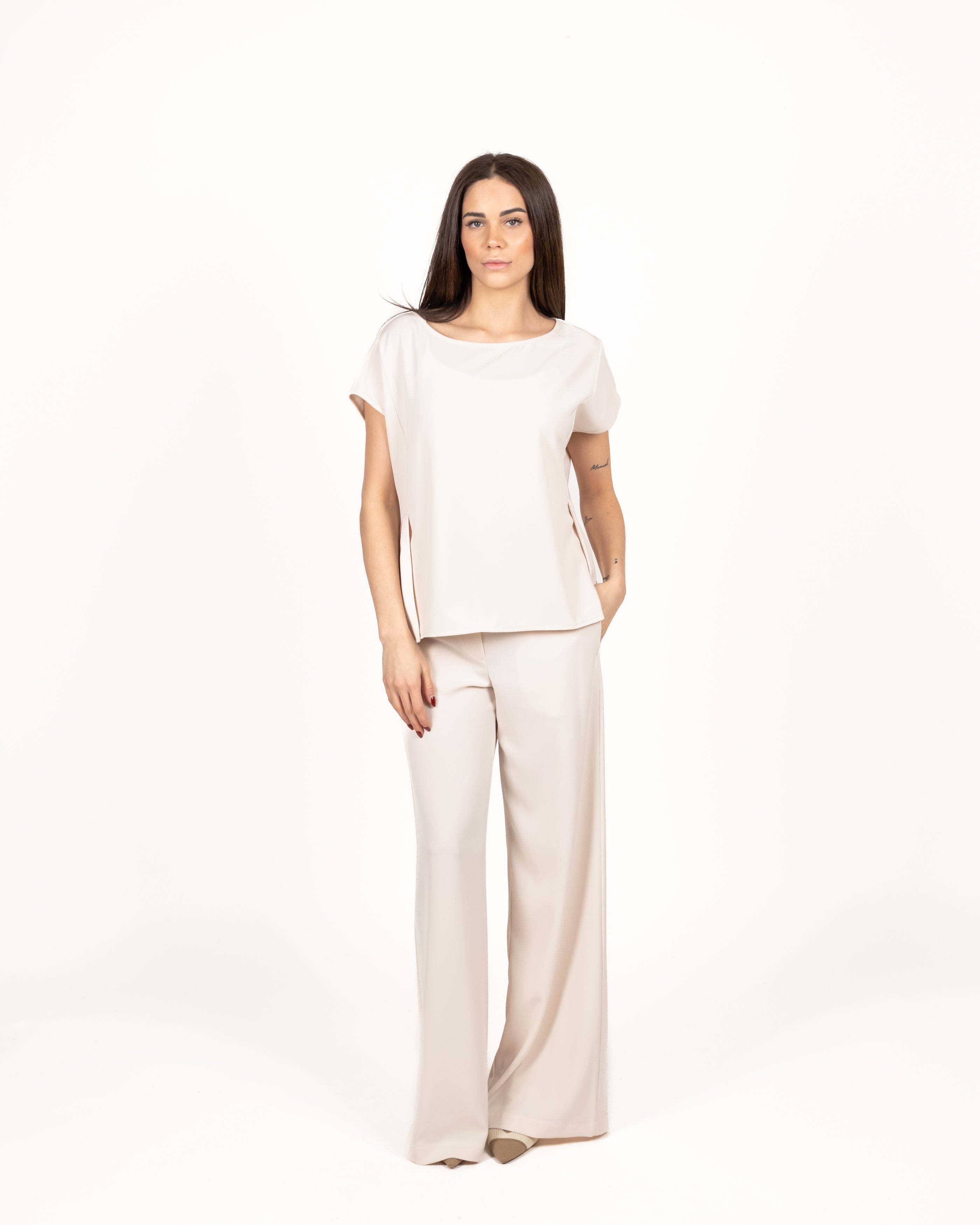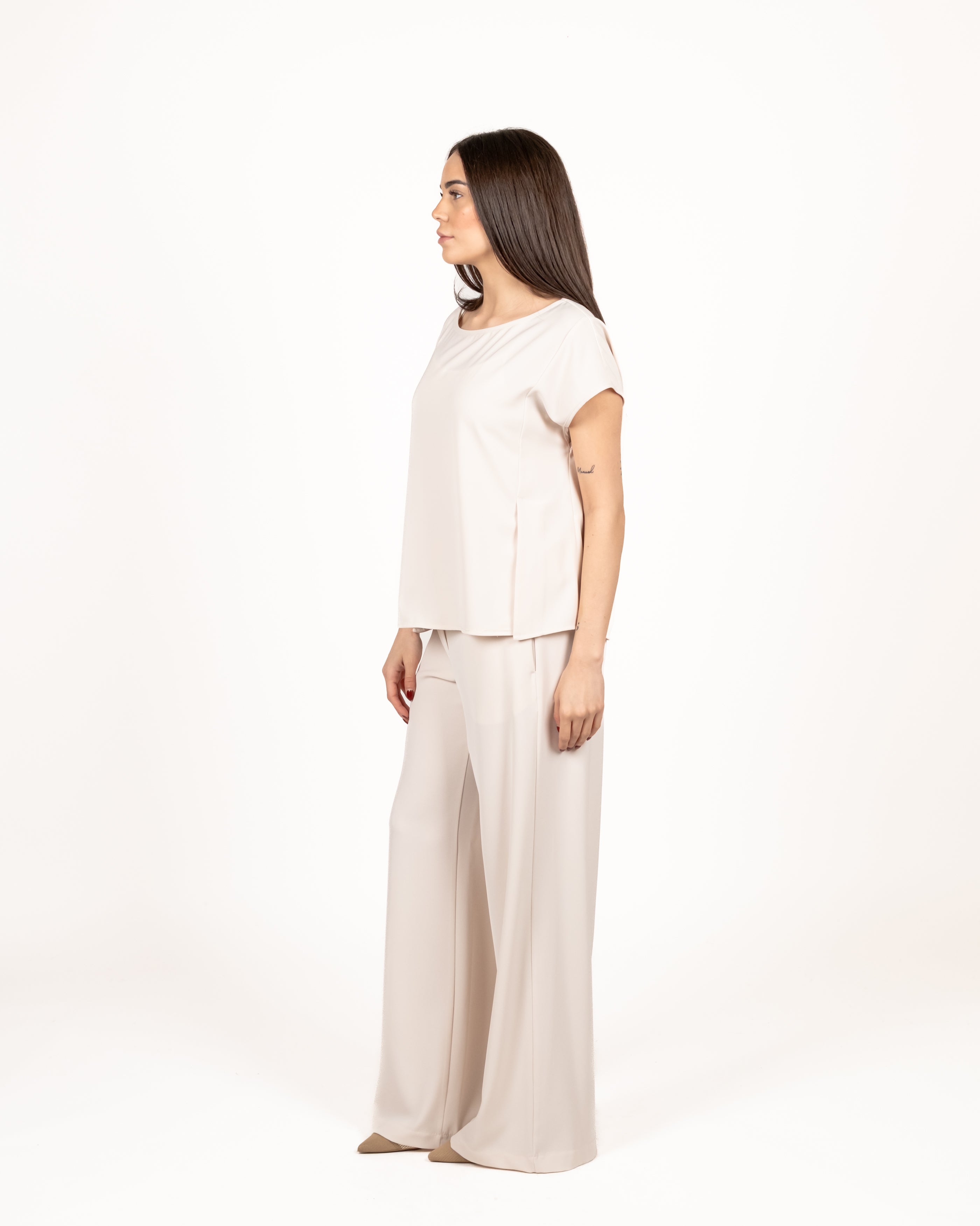Completo blusa con spacchetti davanti e pantalone palazzo con elastico in vita dietro.