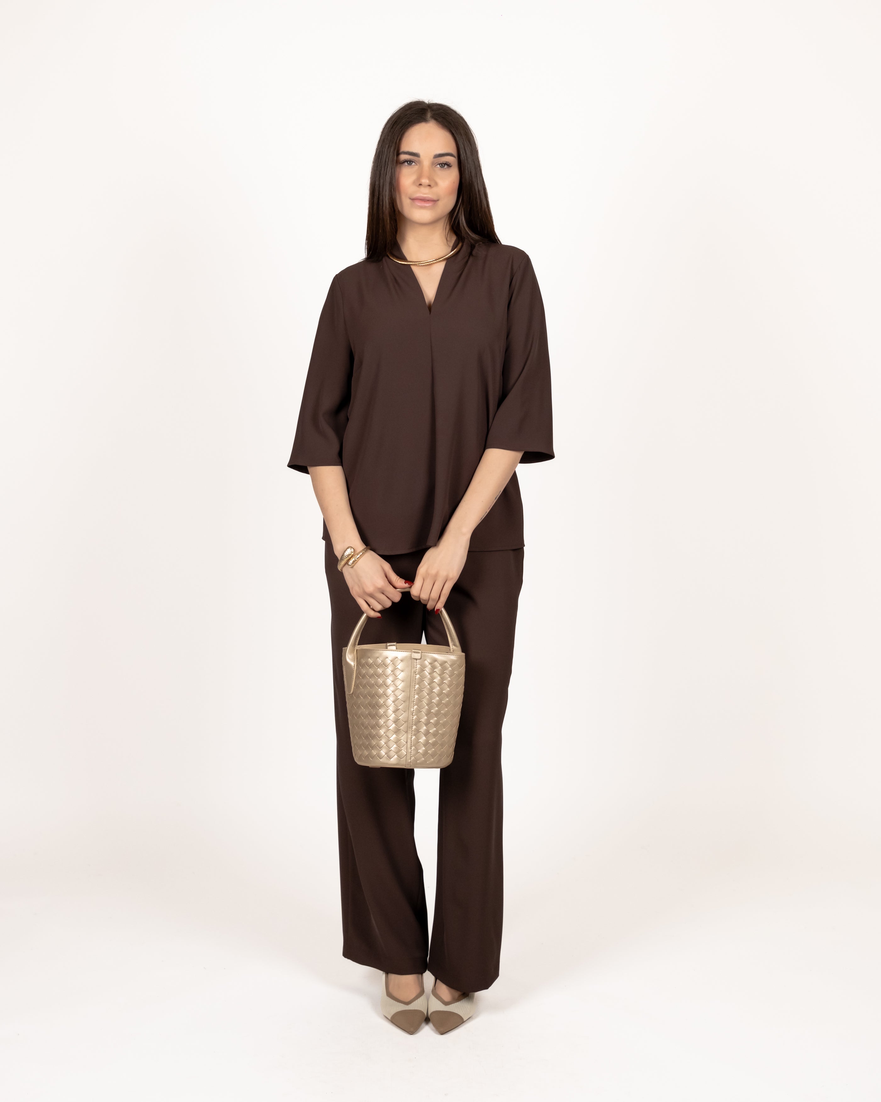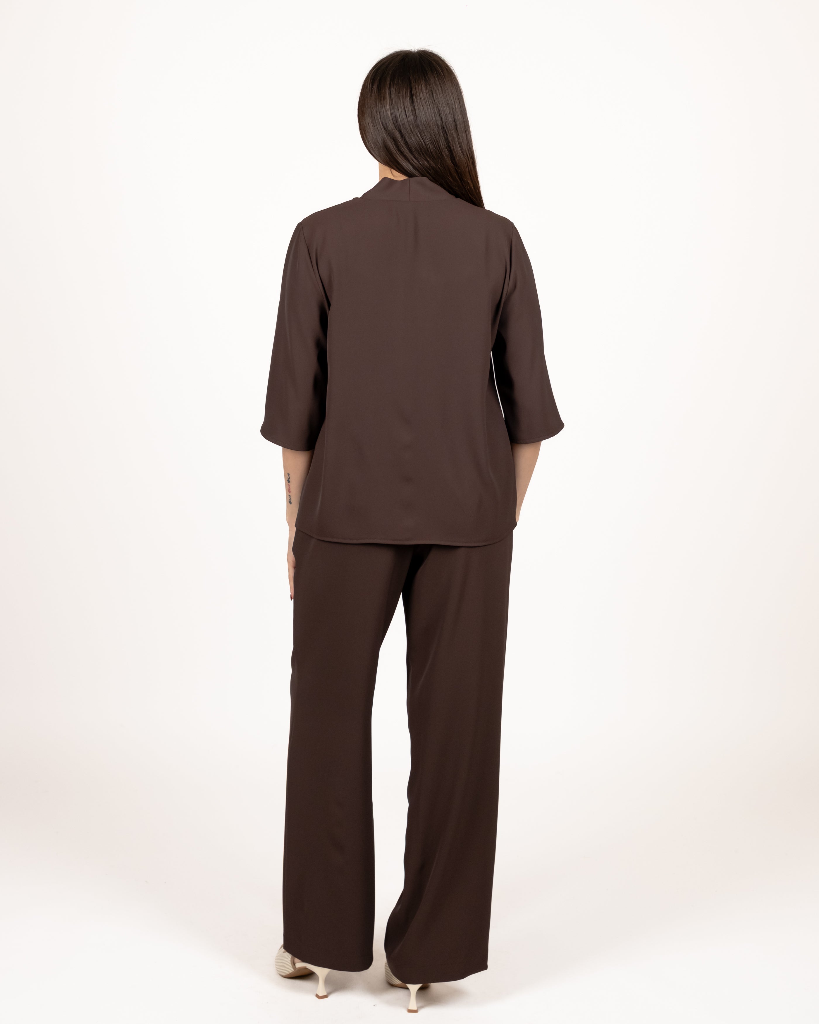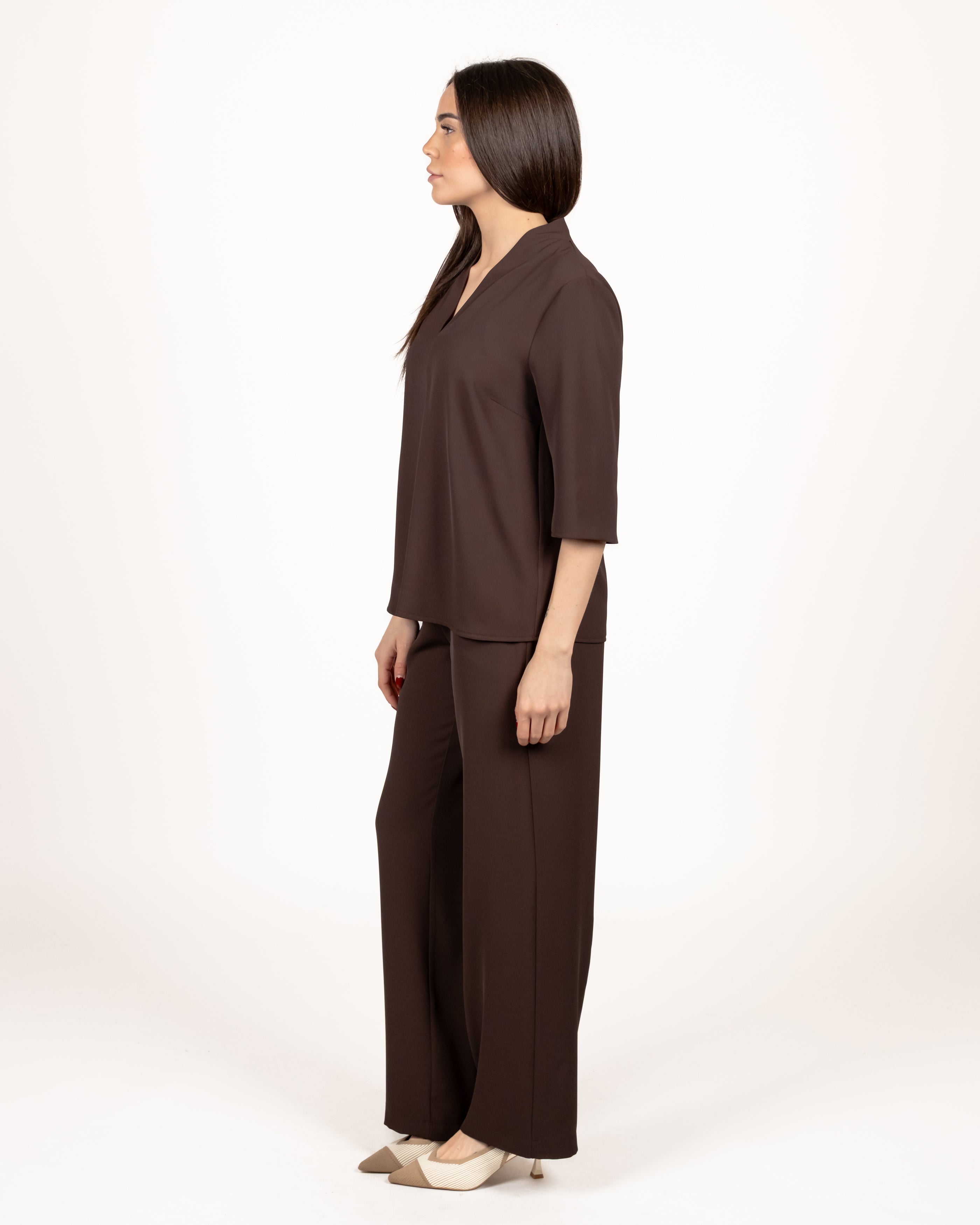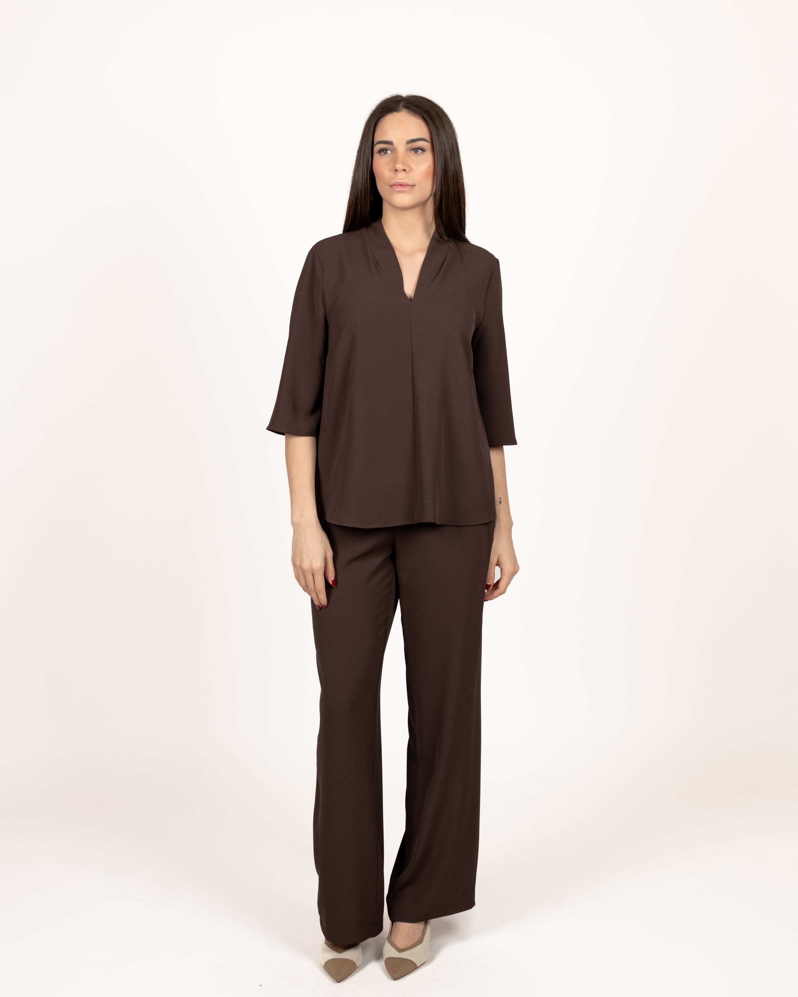 Completo con blusa a V e pantalone palazzo con elastico in vita dietro.