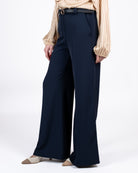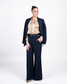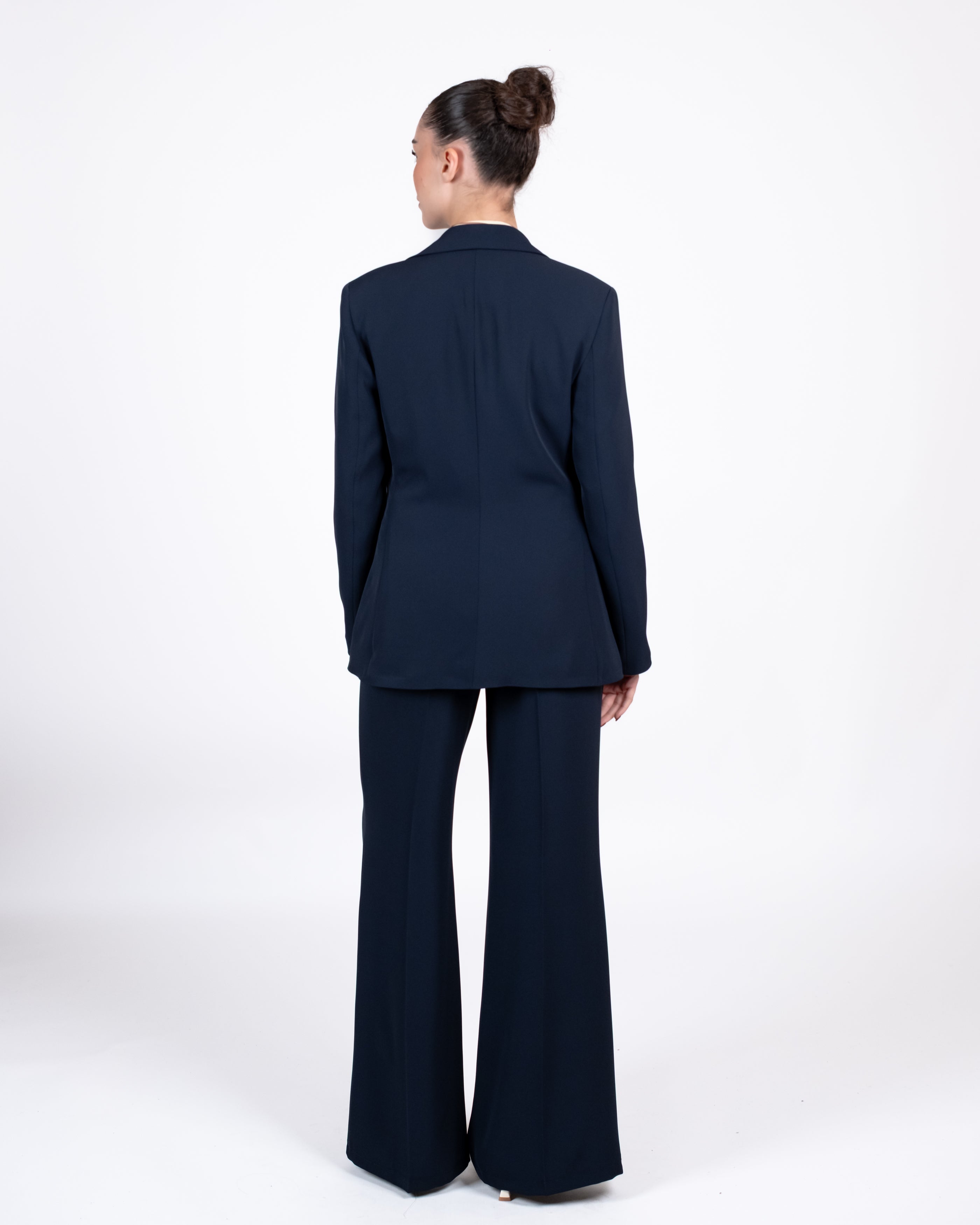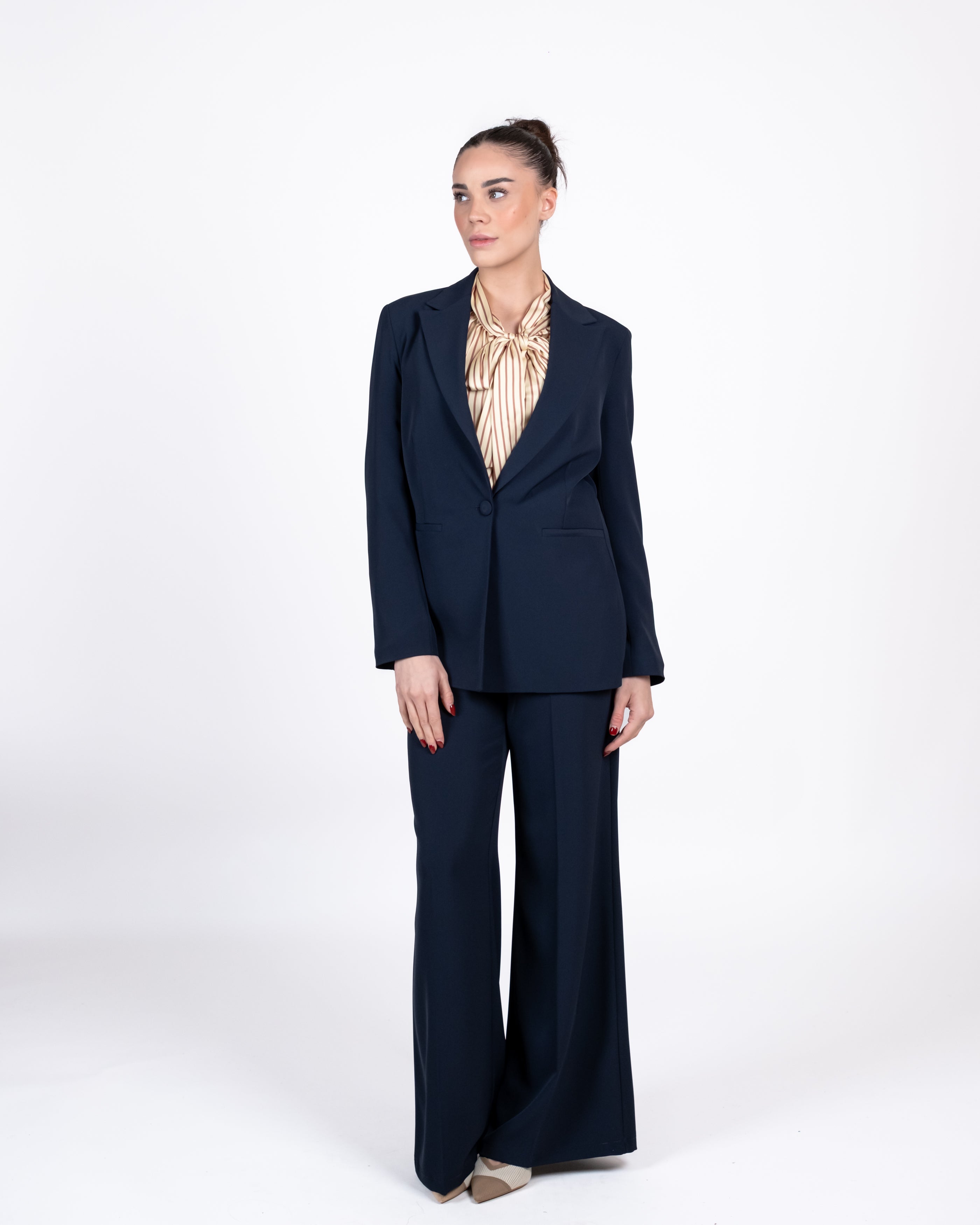 Completo in tessuto fluido con giacca ad 1 bottone e tasca a filo, pantalone palazzo con elastico dietro e tasca.