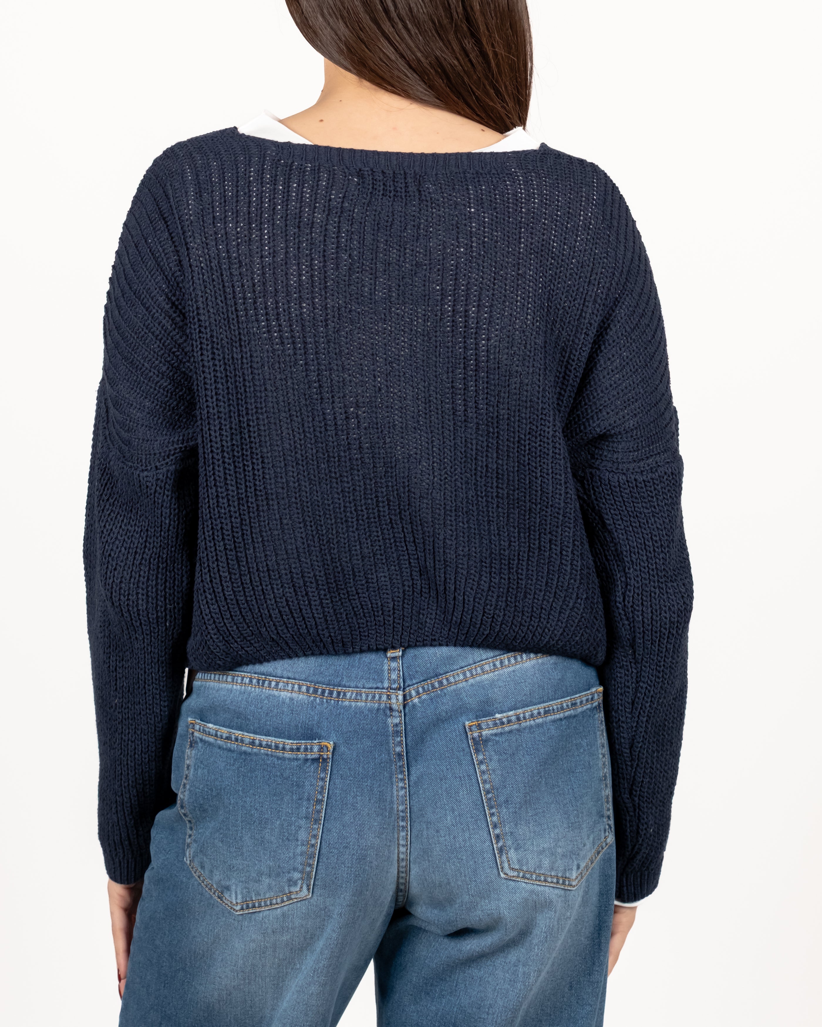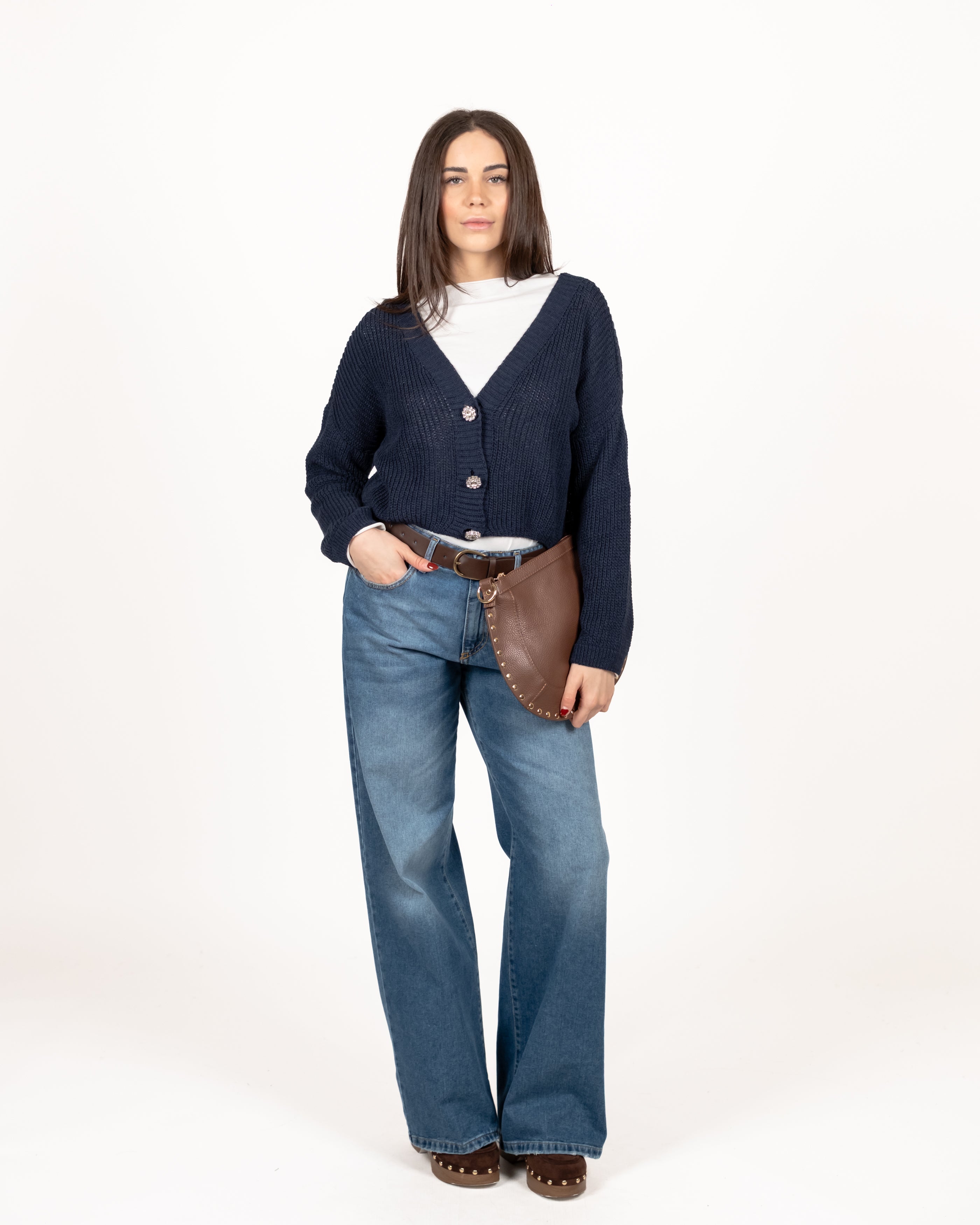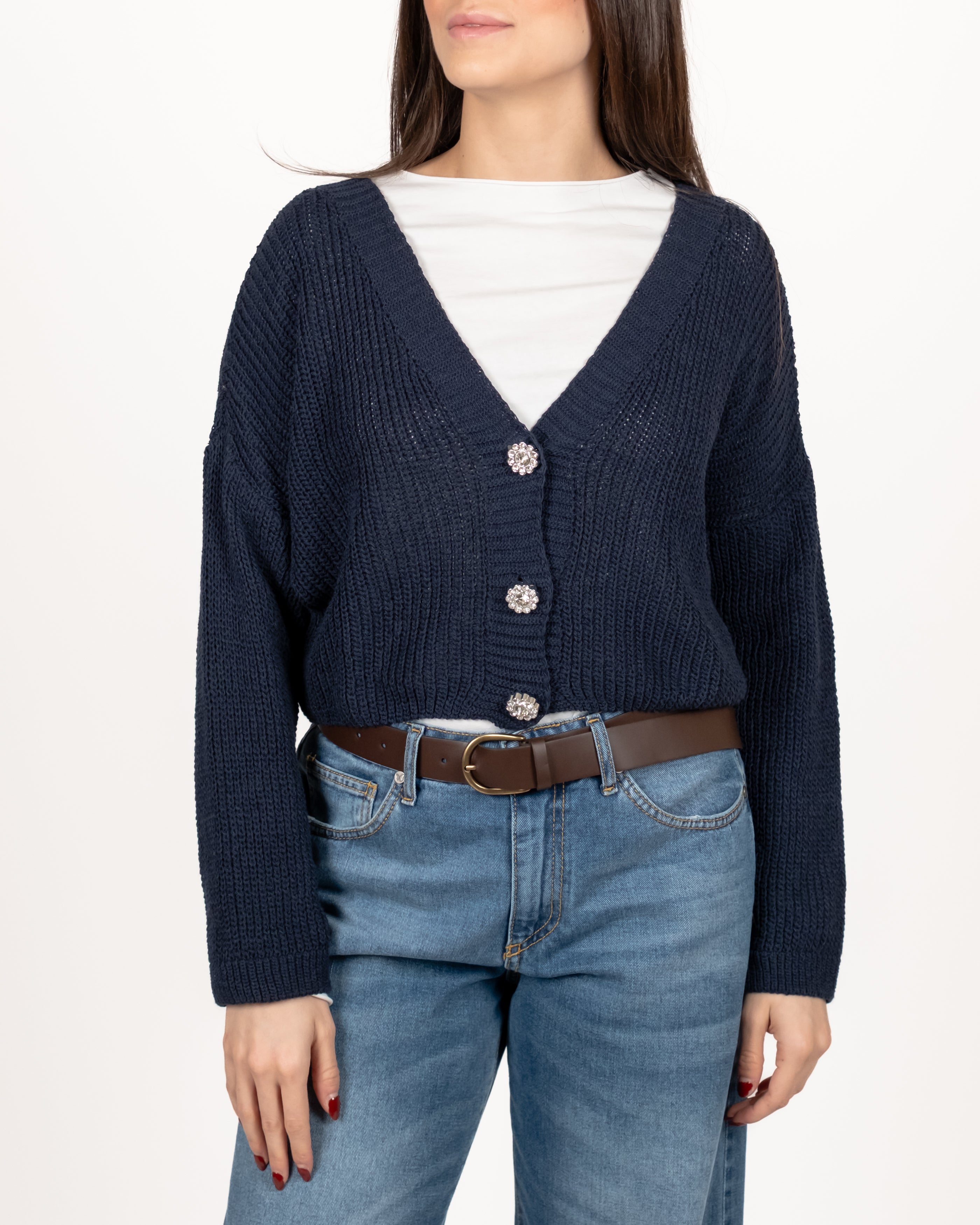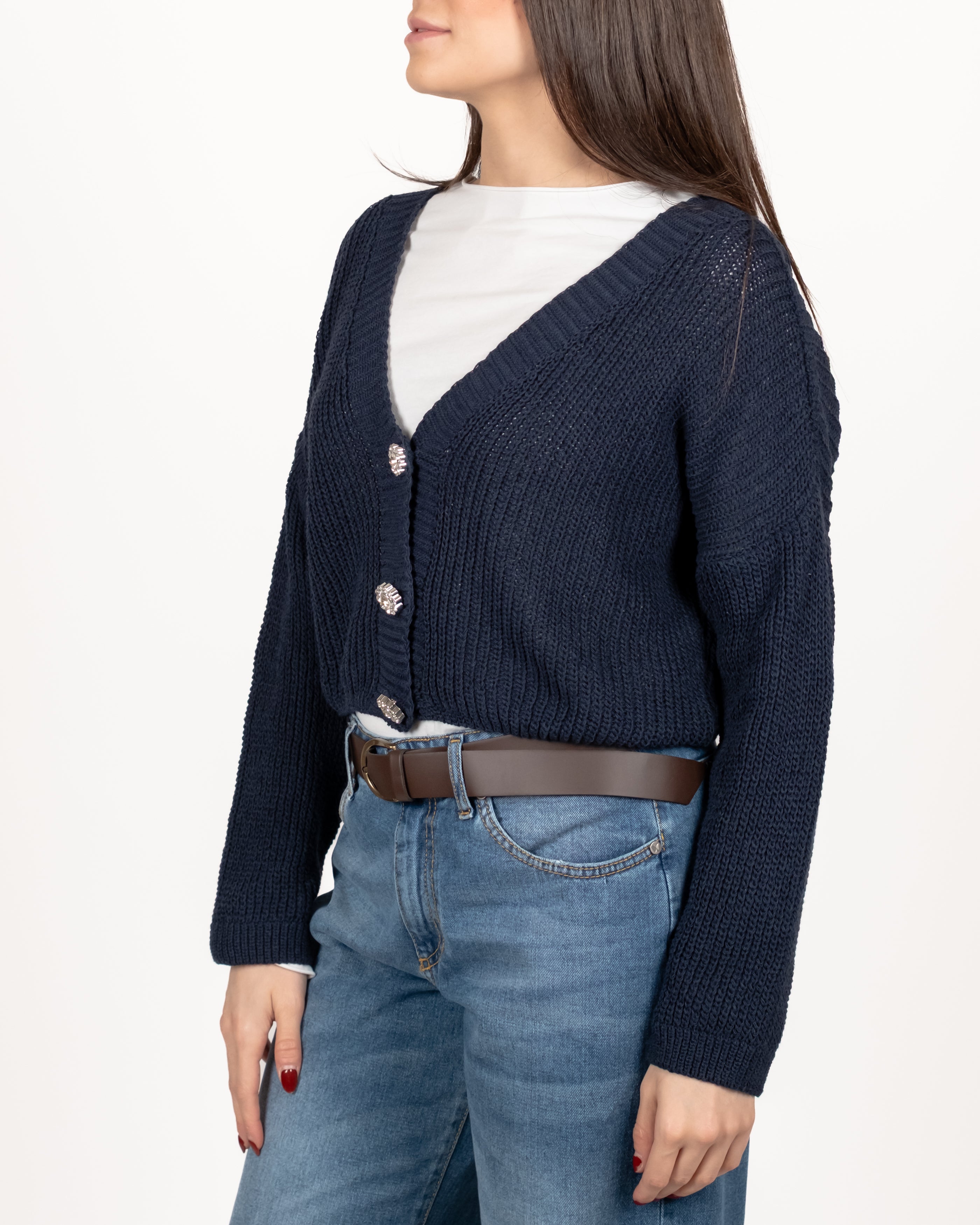 Cardigan drop a coste inglesi con bottoni gioiello.