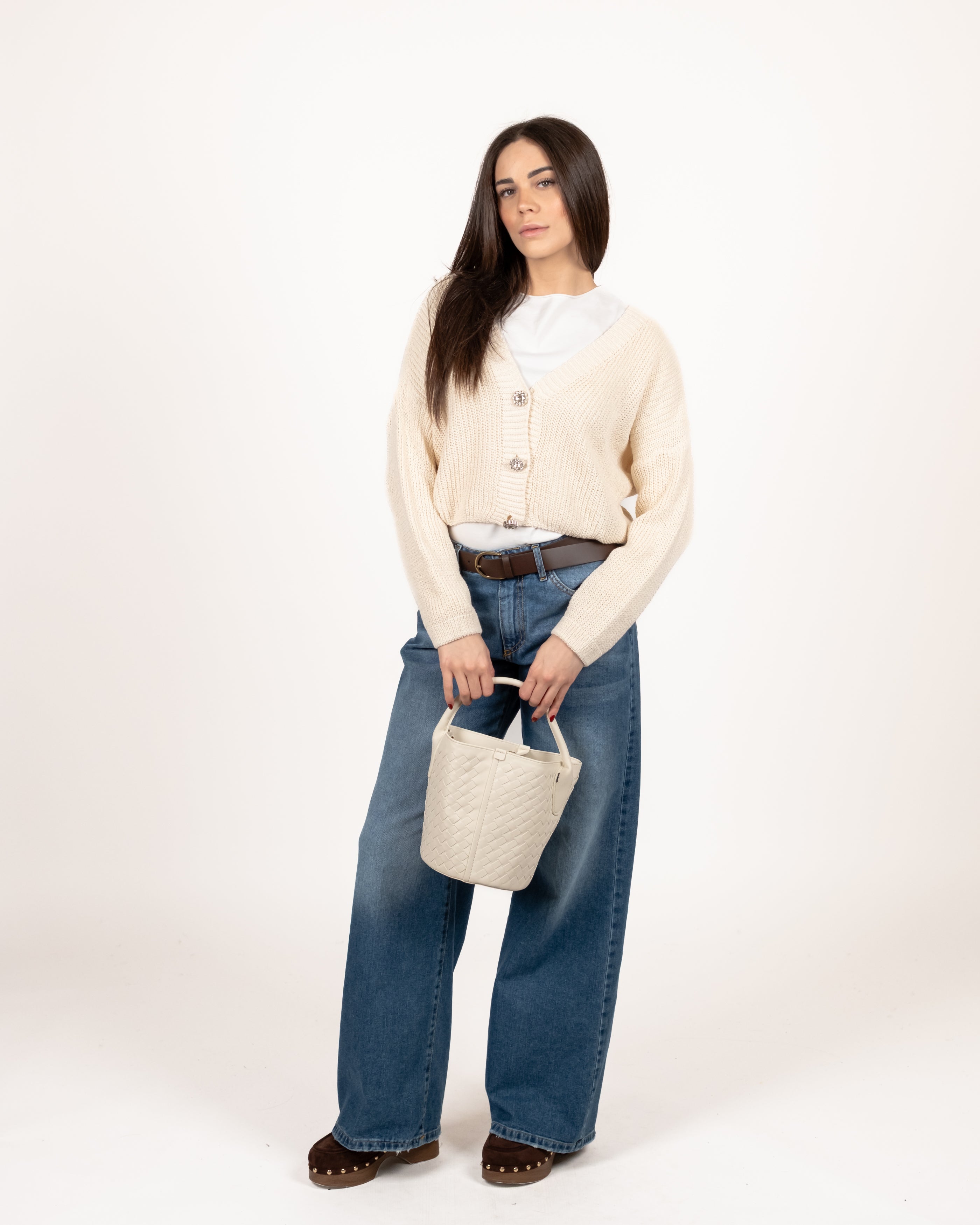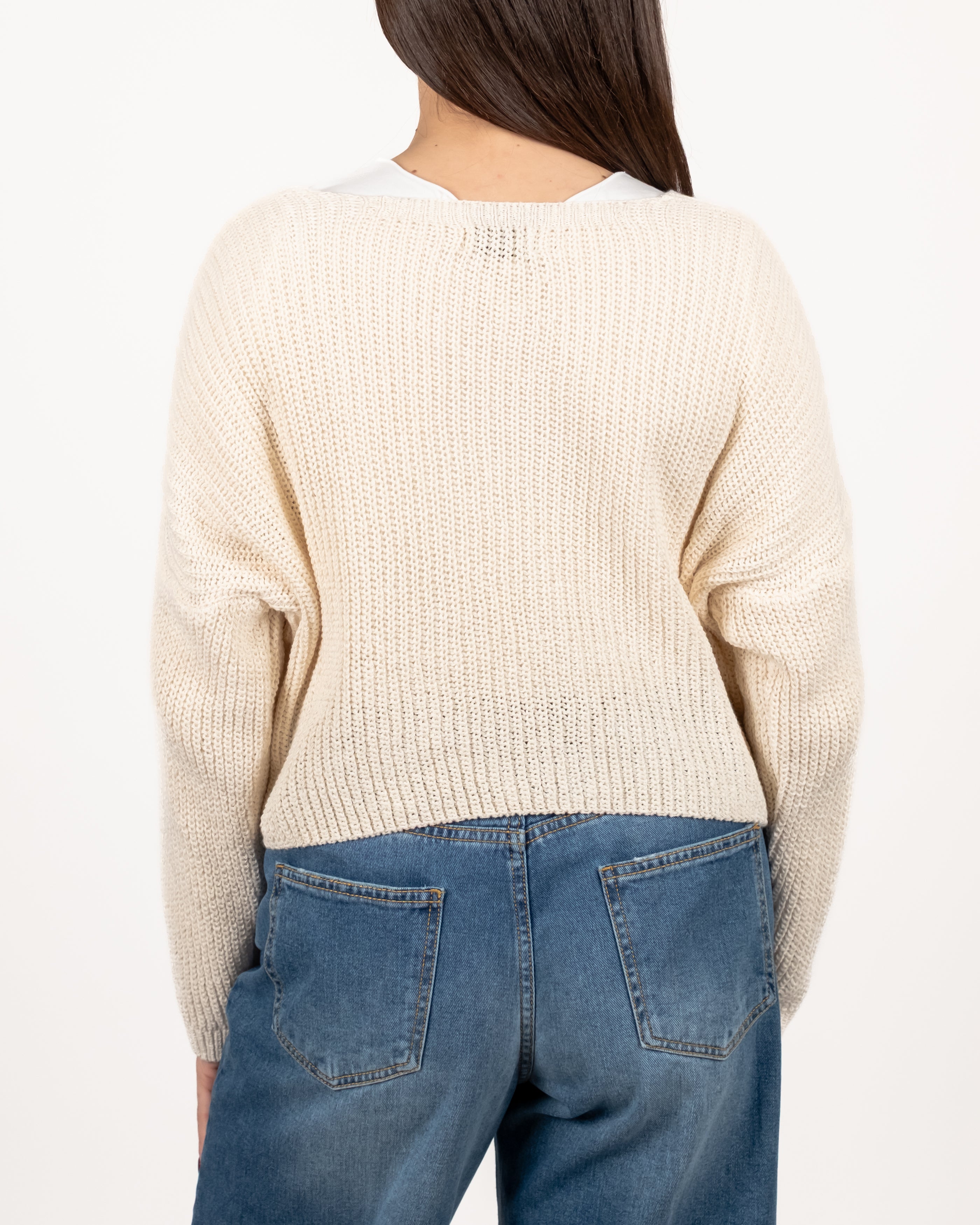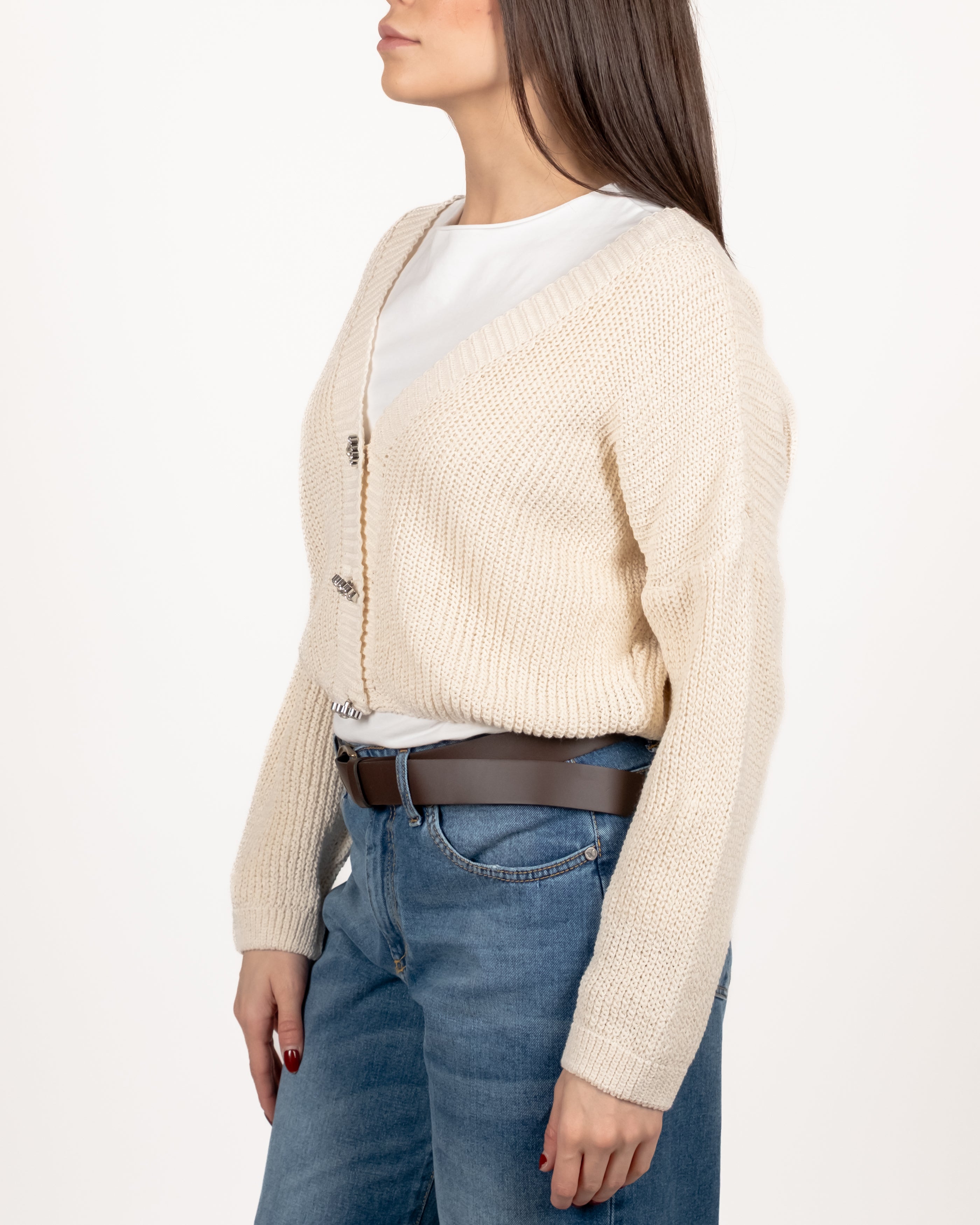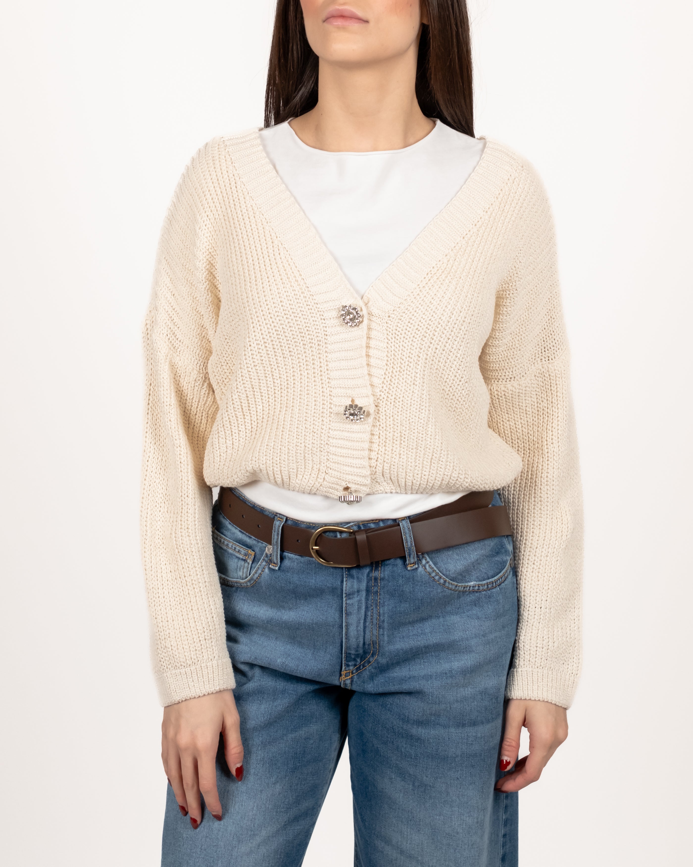 Cardigan drop a coste inglesi con bottoni gioiello.