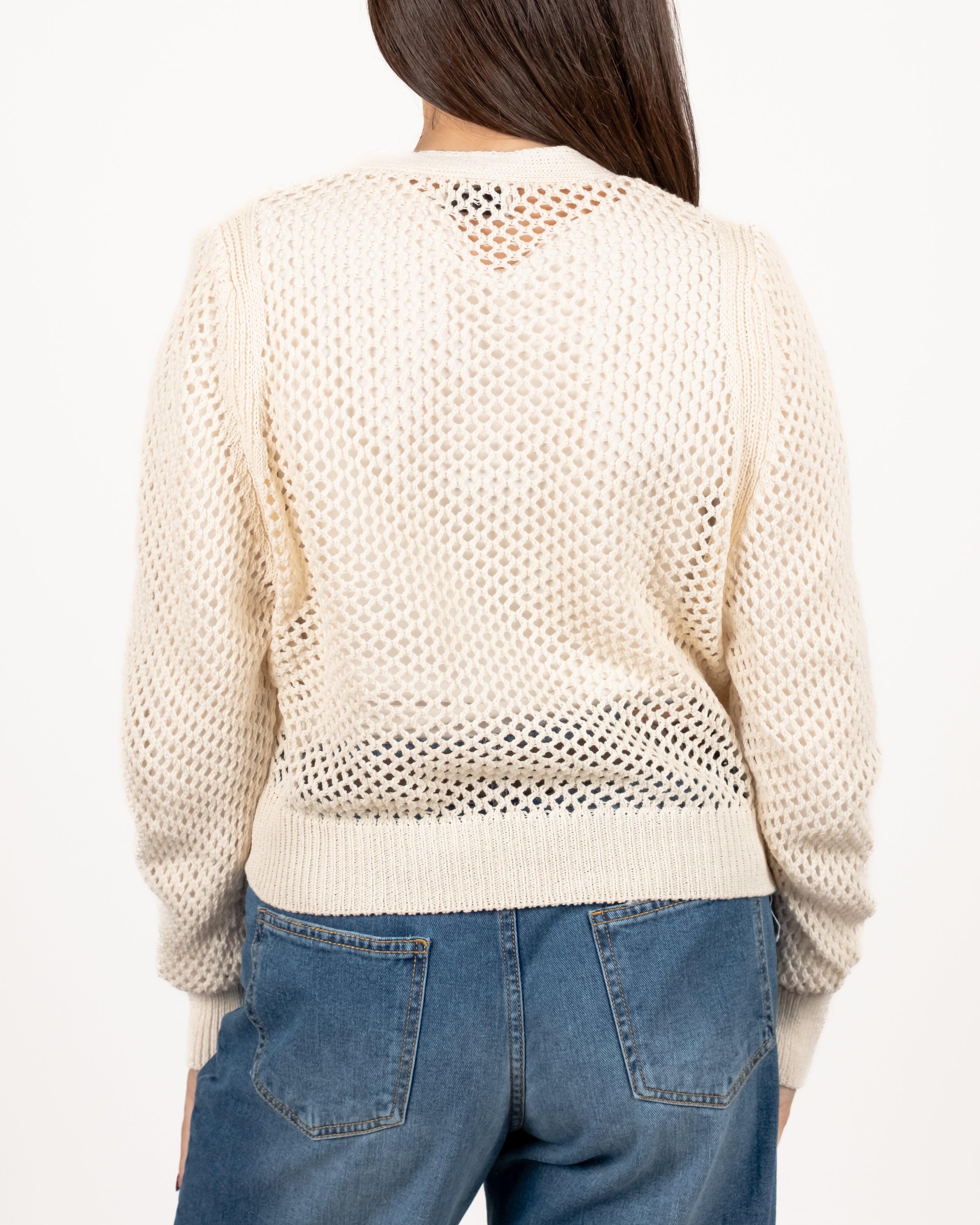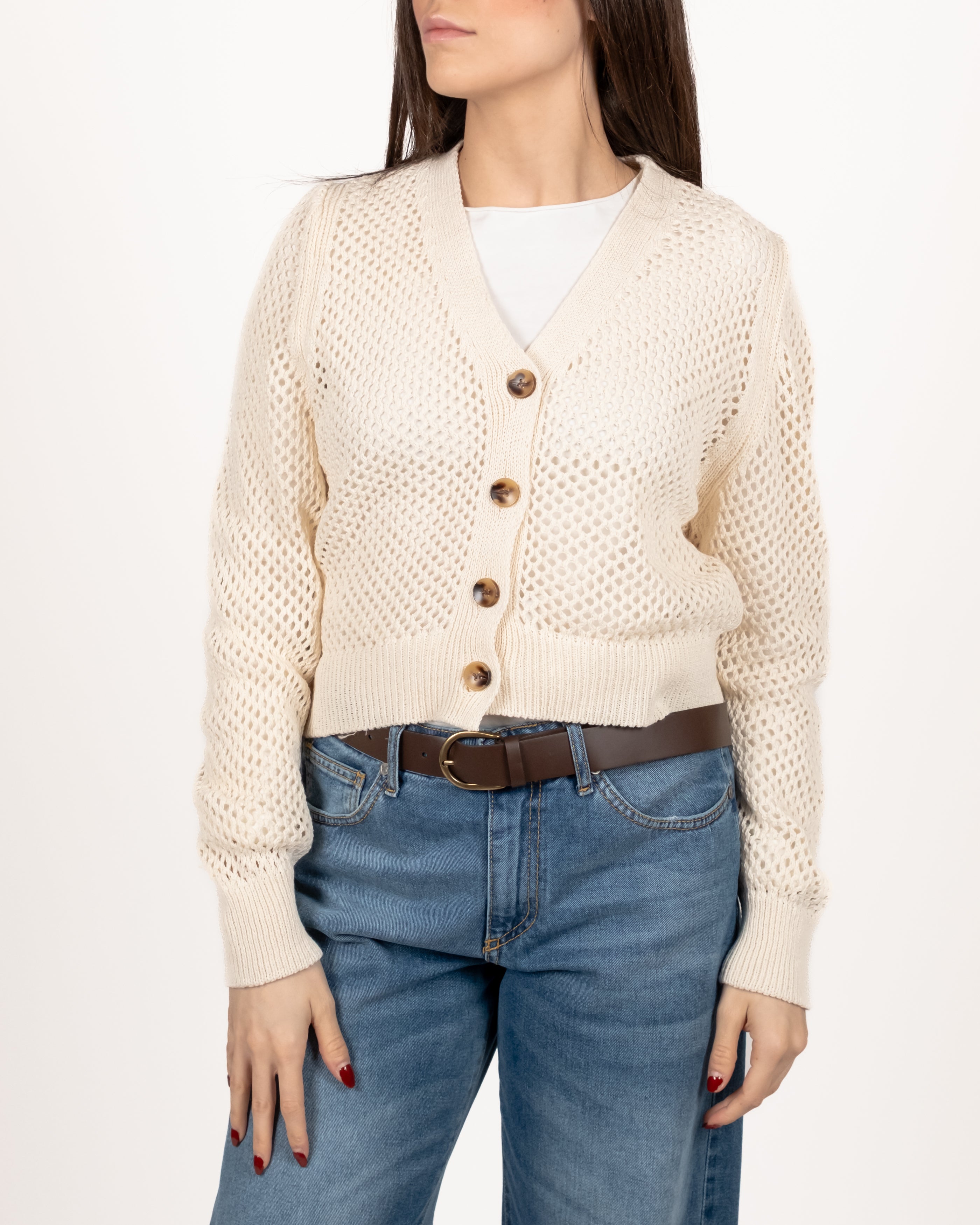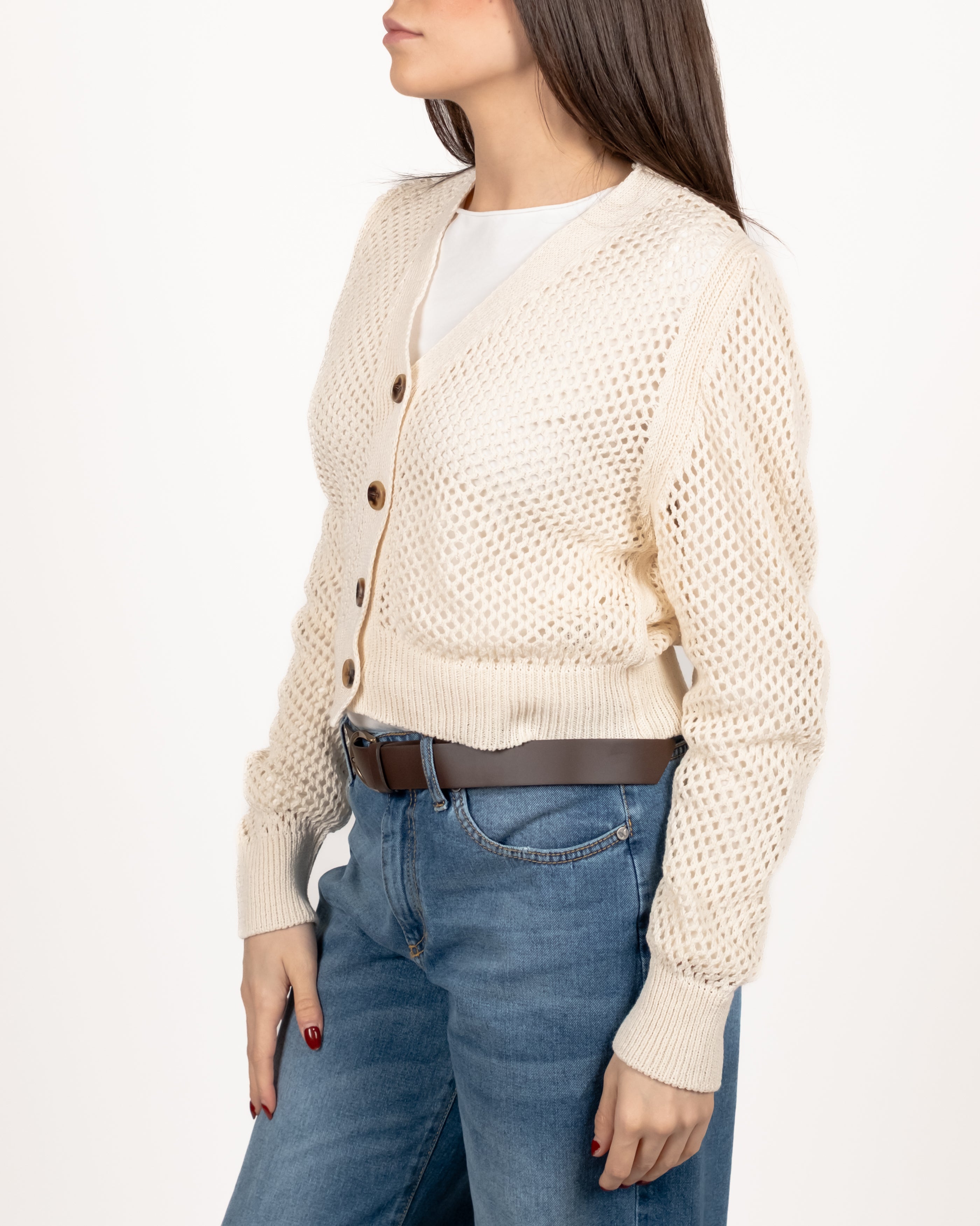Cardigan traforato quattro bottoni.