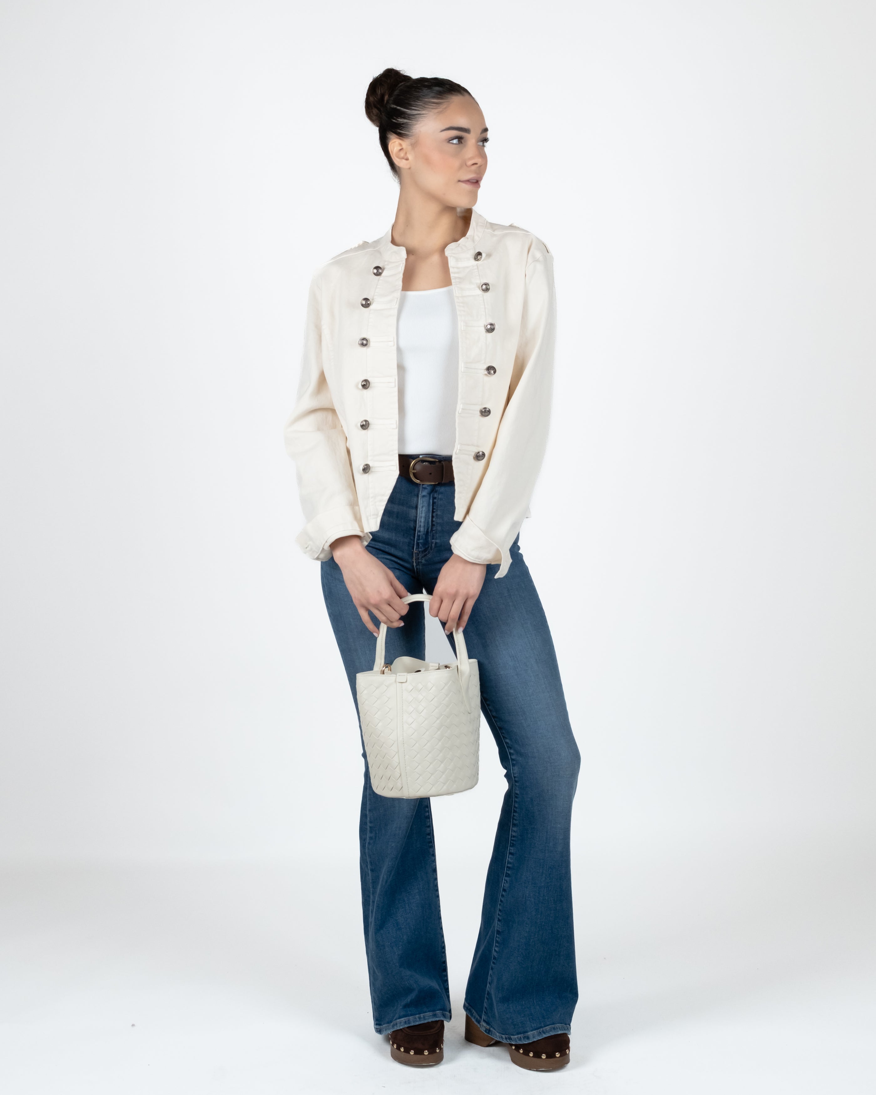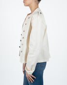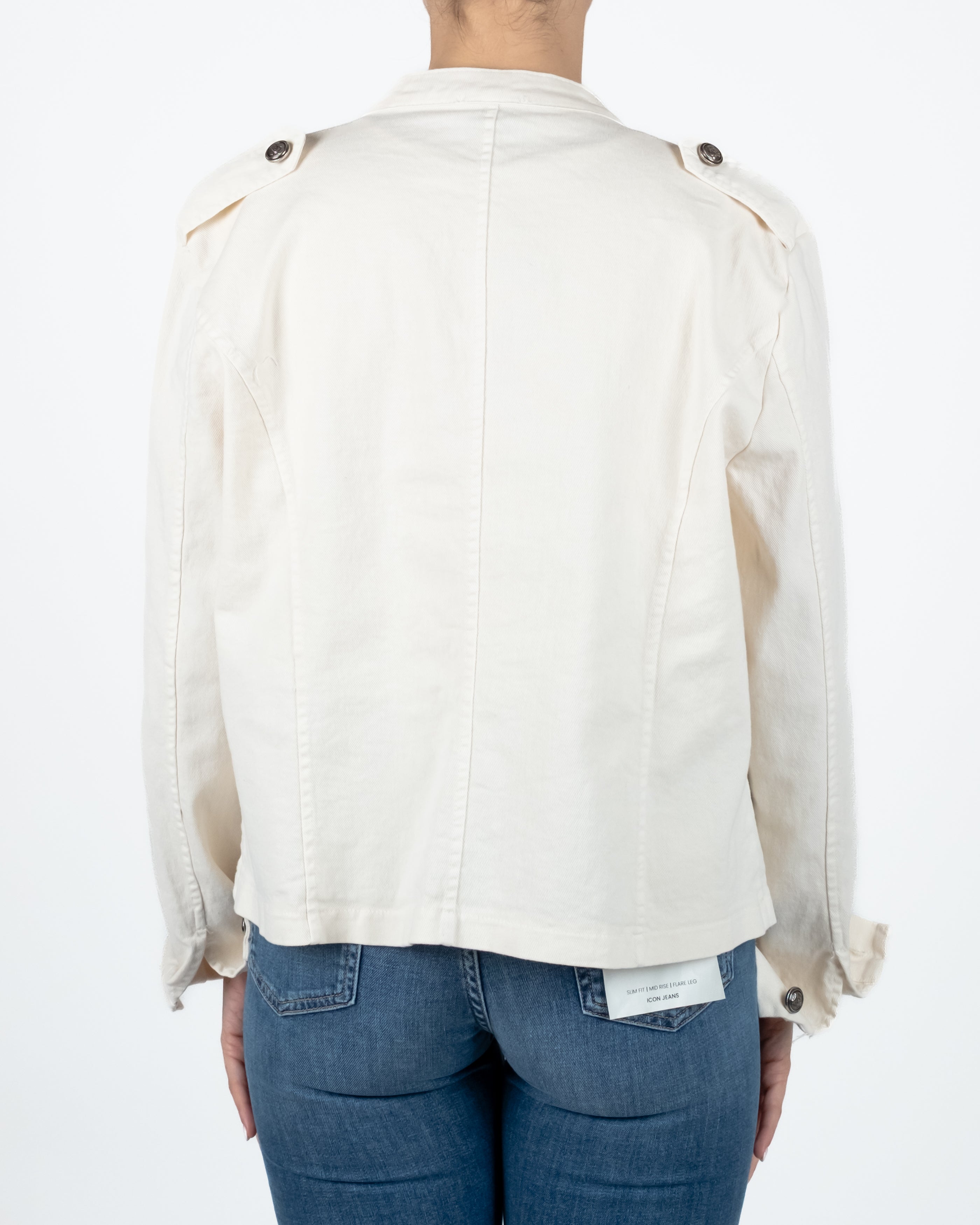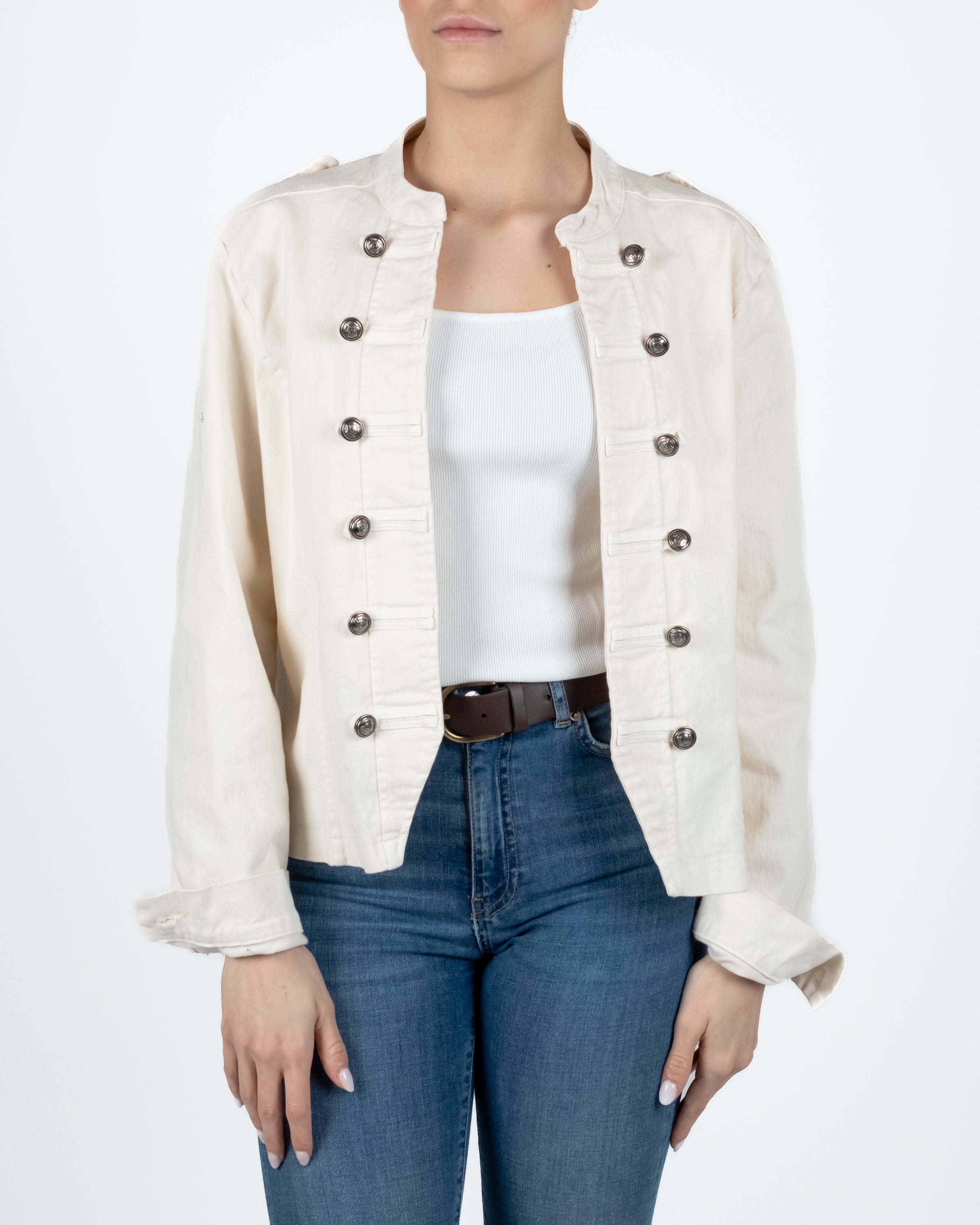Giacca aperta modello Napoleone con cuciture e bottoni sul fronte.