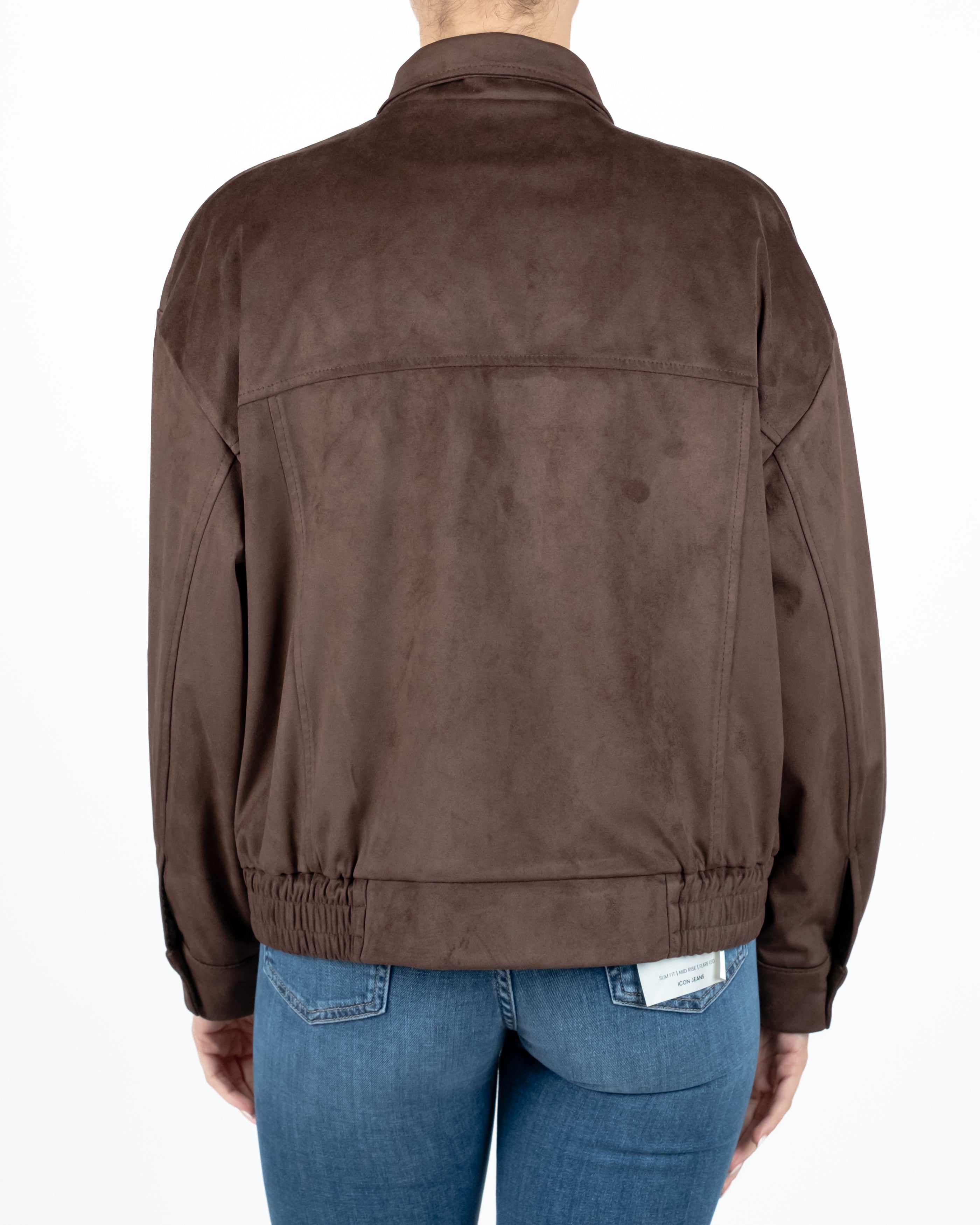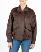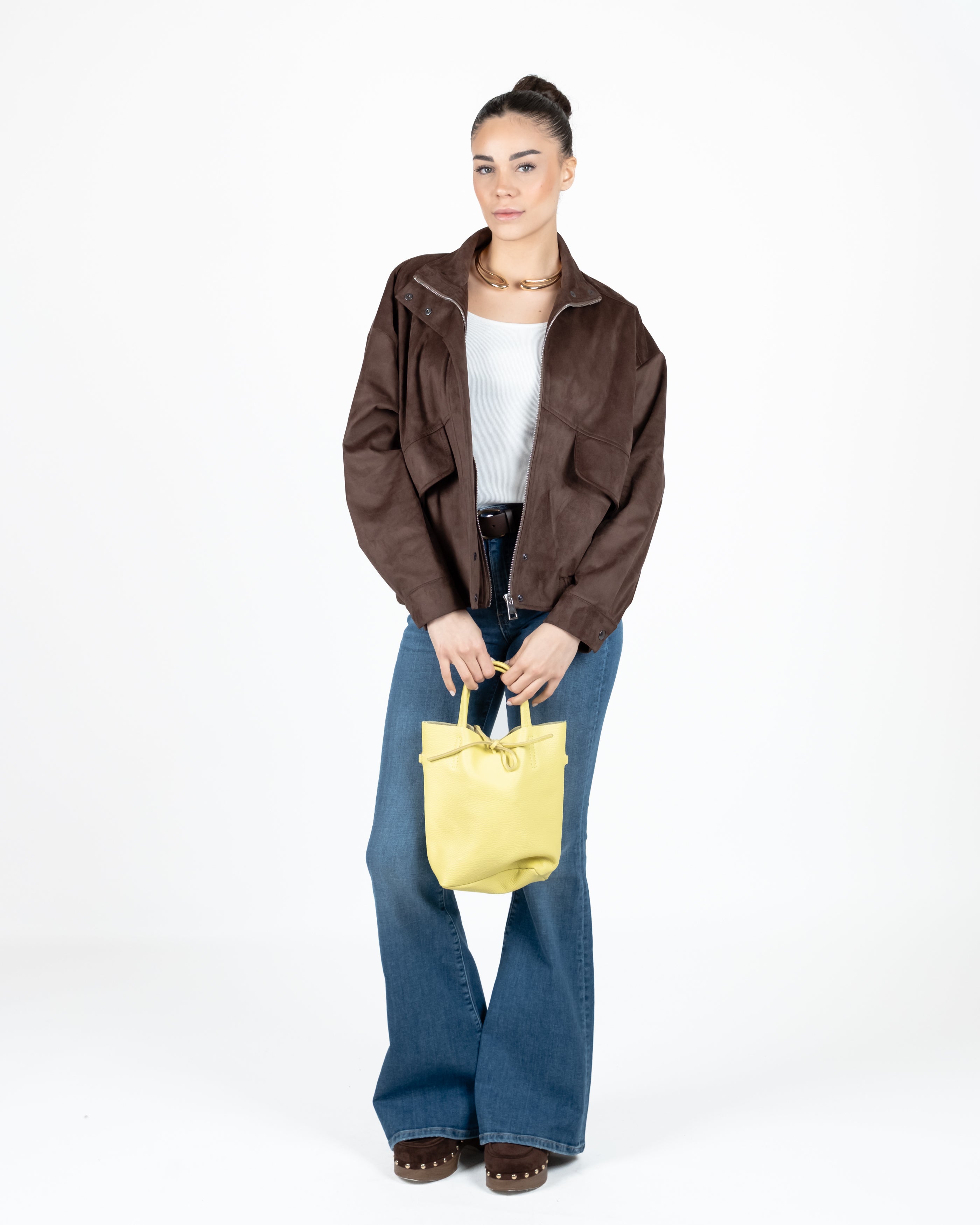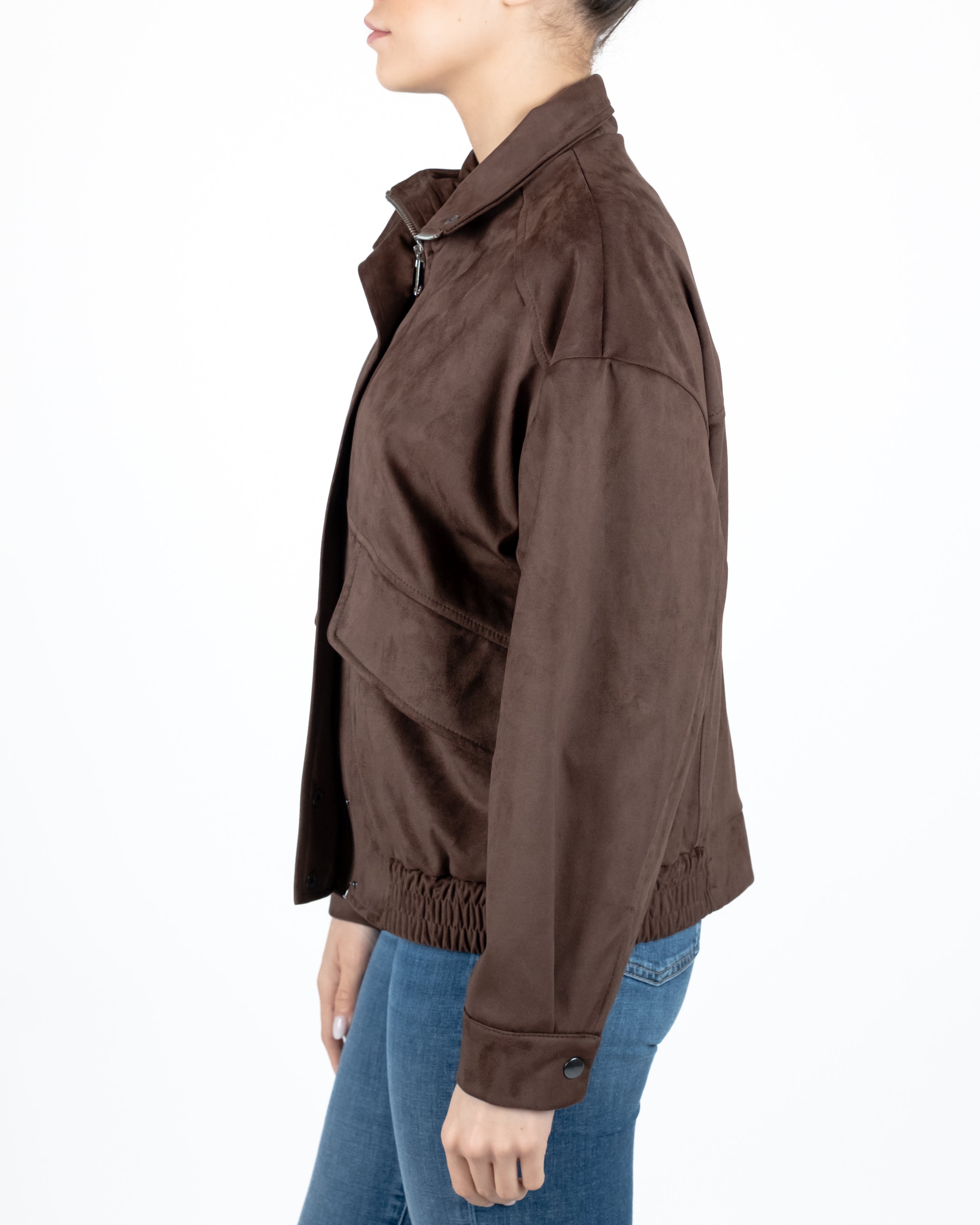 Giubbino modello bomber in dainetto con tasche frontali e chiusura a cerniera.